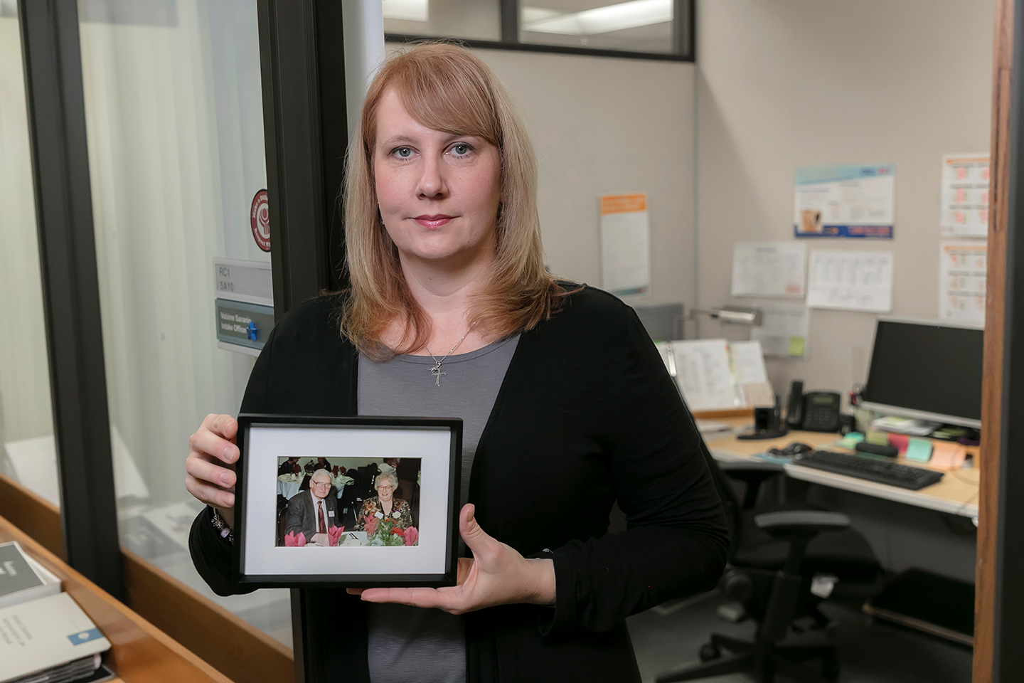 She has written her father's name — "John Bizovie, 1994" — on the Day of Mourning sticker in her office. In his honour, she commemorates Day of Mourning each year, but finds it very emotional.