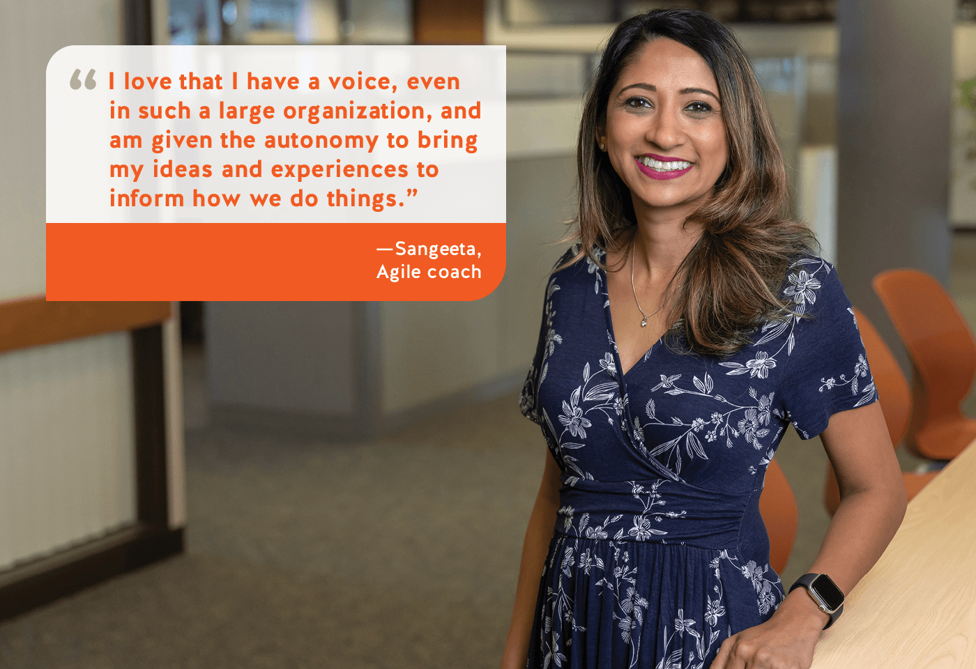I love that I have a voice, even in such a large organization, and am given the autonomy to bring my ideas and experiences to inform how we do things. I feel comfortable suggesting change and experimenting. I also feel there’s a culture here that encourages continuous improvement, having a growth mindset, and inclusivity.