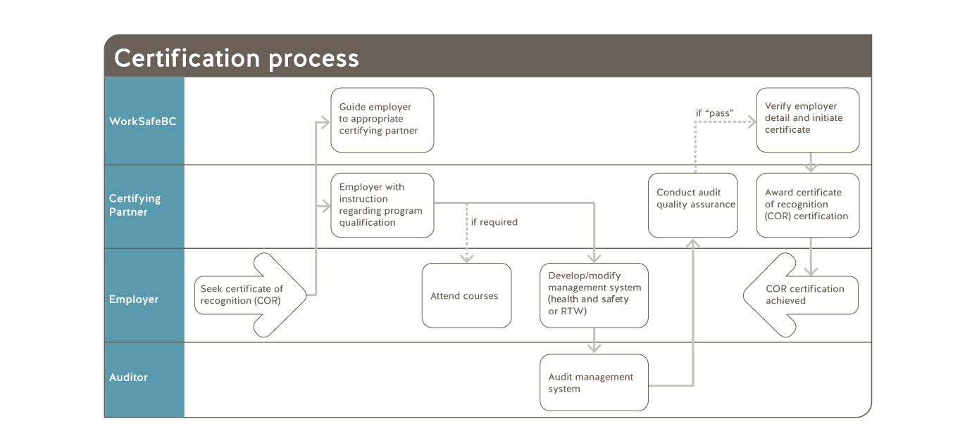 There are four key players in the certificate of recognition (COR) program: the employer, certifying partner, WorkSafeBC, and auditor(s). Each plays an important role at various points in the certification process. For more details about the responsibilities of each party, see the Certificate of Recognition Program Standards and Guidelines document.