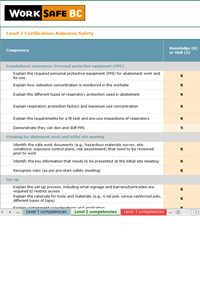 Level 2 certification is for anyone conducting asbestos abatement work in relation to a building. Level 1 is a prerequisite for Level 2, although the training program may combine both levels. Training programs for this level must cover the Core competencies for Level 2 certification. Assessment for this level includes both a certification exam and a practical skills test. The Level 2 practical skills test guide provides suggestions for the design and implementation of this testing component. |