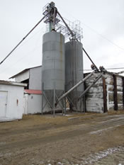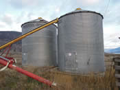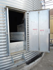 Feed bins are elevated above ground and have tapered bases and an entry hatch in the top. These bins are confined spaces.