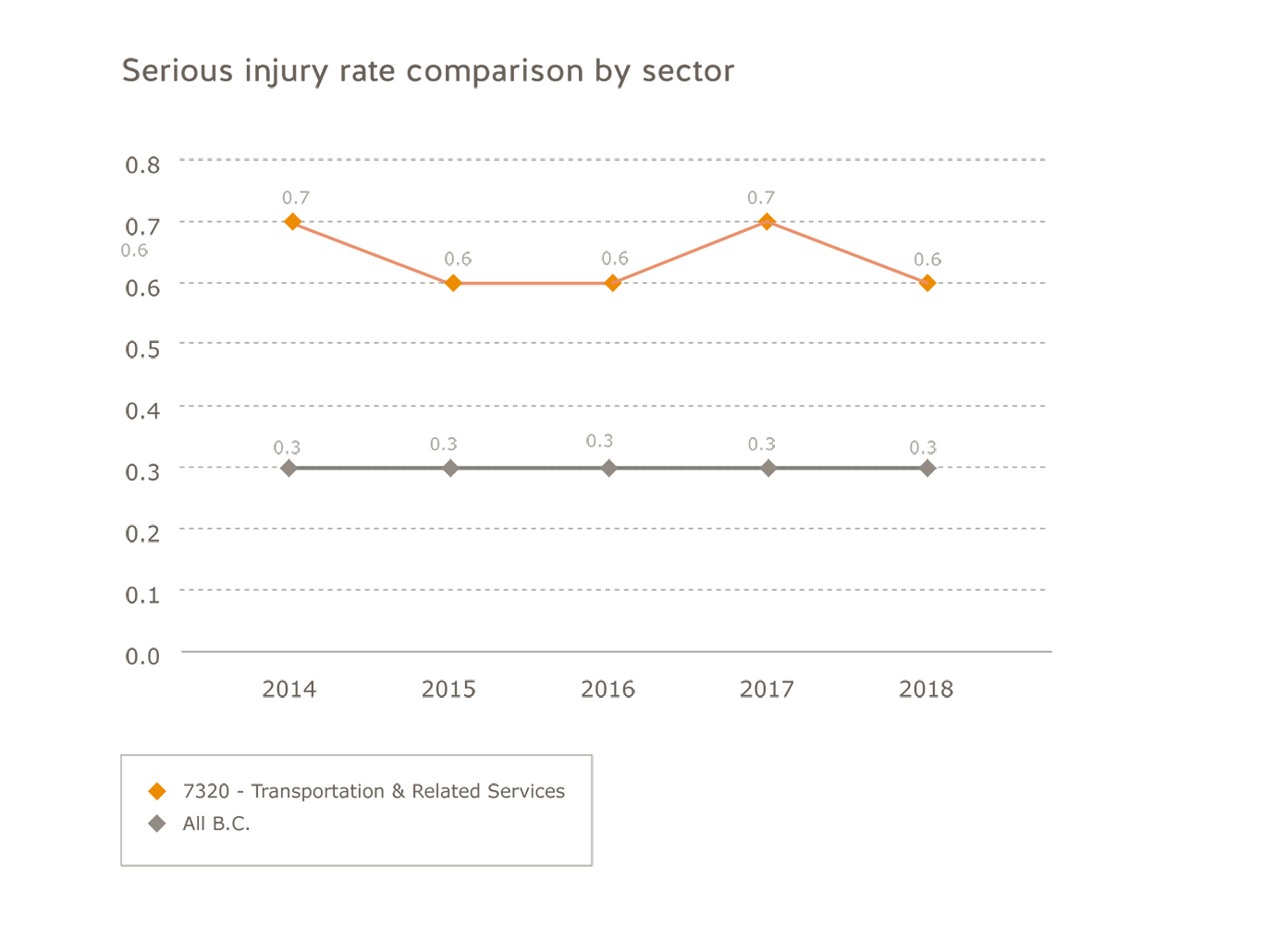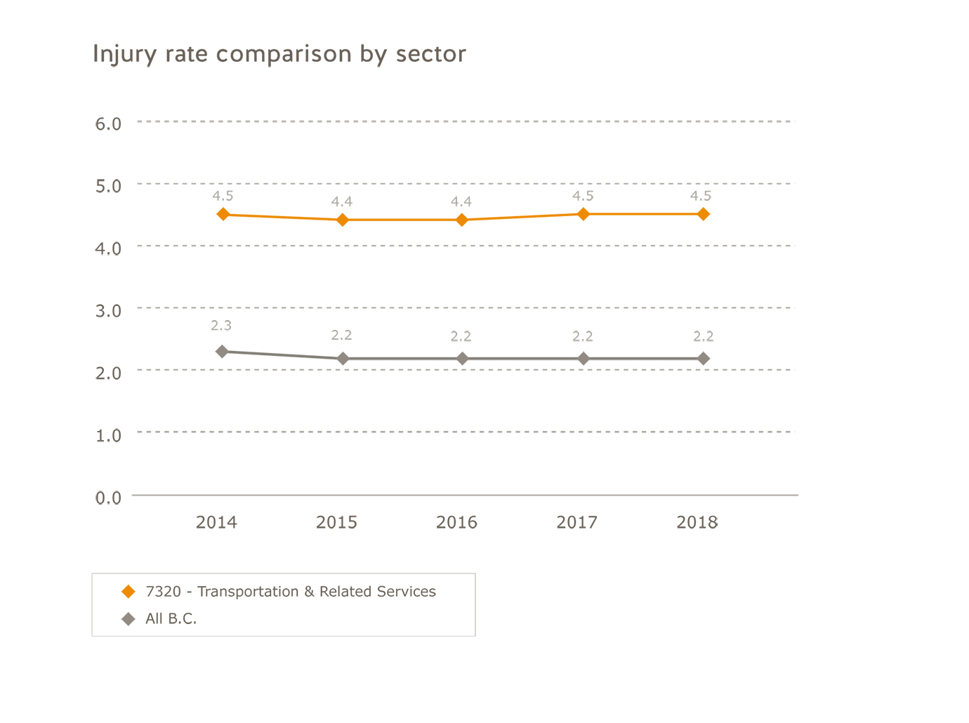 To see health and safety statistics for your industry, visit Industry health and safety data. You can use our industry data tools to identify opportunities to improve health and safety in your workplace and compare your industry with other industries in B.C. The information is available to everyone and presented in charts and graphs to use in research, reports, or business plans.