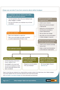 Workers who have concerns about the requirement to wear safety headgear should talk to their employer, supervisor, and/or joint health and safety committee (or worker representative). Safety headgear: Rights and responsibilities provides further information on workers’ rights related to safety headgear. It also includes a process map outlining the steps workers can take if they have questions or concerns about the use of headgear at their workplace.