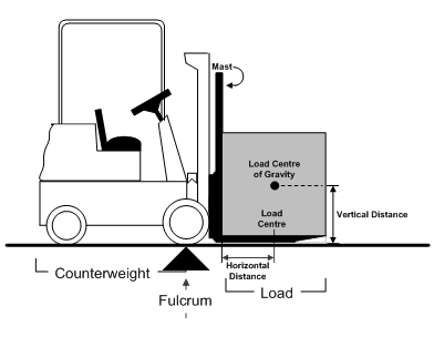 As a load centre distance increases the "load moment" increases. The load moment, or moment, is the product of the load's weight multiplied by the distance of the CG of the load to the fulcrum (pivot point). It is the moment that determines how much overturning force is being applied to the lift truck. For example, if a forklift's stated capacity rating is 3,000 pounds at a 24 inch load centre, the load moment cannot safely exceed 72,000 inch-pounds (24 inches x 3,000 lb = 72,000 inch-pounds). If the load centre distance for the actual load is greater than 24 inches, the only way to keep the load moment from exceeding 72,000 inch-pounds, which could result in the forklift tipping over laterally, is to reduce the load.