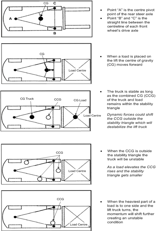 A lift truck's steer axle is attached to the truck by a pivot pin in its rear axle's centre. When this point is connected to the centre of the two front wheels with imaginary lines it forms a triangle called the stability triangle. A lift truck and load each has its own CG. When a load is placed on a lift truck, the CG of the truck shifts, and a combined centre of gravity (CCG) is created. If the CCG is located outside the stability triangle, unstable conditions are introduced causing the truck to tip over either laterally on its side or tip longitudinally forward. Tip direction is determined by where the CCG is outside the stability triangle. See Figure 2.