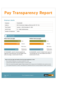 As a provincial agency, WorkSafeBC publishes an annual Pay Transparency Report of our pay data to support the identification of pay differences between groups of workers, specifically pay gaps among genders.