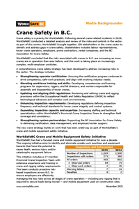 The following media backgrounder provides an overview of crane safety in B.C. It discusses increasing risks in the sector, and WorkSafeBC’s new crane and rigging strategy to address those risks. The new crane strategy builds on work that has been underway as part of WorkSafeBC’s crane and mobile equipment safety initiative.