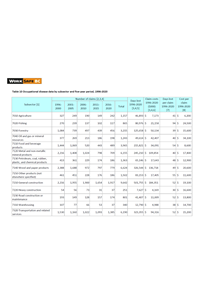 This table provides the claim count for occupational diseases by subsector, for each 5-year period between 1996 and 2020. The total claim count, days lost, claim costs, days lost per claim, and costs per claim are also included for the same period.
