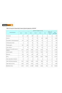 This table provides the claim count for occupational diseases by exposure group, for each 10-year age group between 15 and 64 years, and 65+ years, for the 25-year period from 1996 to 2020. The total claim count is also included for the same period.