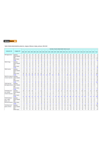 This table provides the claim count for work-related deaths by broad category of injury and disease, and by subsector, for each year between 1996 and 2020. The total claim count is also included for the same period.