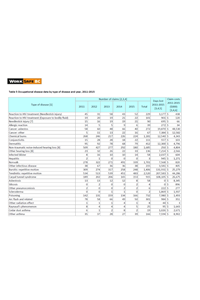 This table provides the claim count by type of occupational disease, for each year between 2011 and 2015. The total claim count, days lost, and claim costs are also included for the same period.