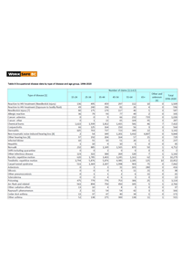 This table provides the claim count by type of occupational disease, for each 10-year age group between 15 and 64 years, and 65+ years, for the 25-year period from 1996 to 2020. The total claim count is also included for the same period.