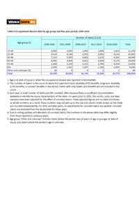 This table provides the claim count for occupational diseases by 10-year age group between 15 and 64 years, and 65+ years, for each 5-year period between 1996 and 2020. The total claim count is also included for the same period.