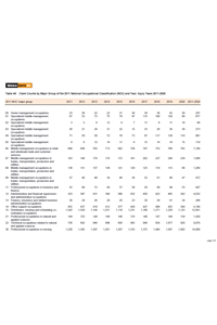 This table provides the claim count for occupational injuries by major group of the 2011 National Occupational Classification (NOC), for each year between 2011 and 2020. The total claim count is also included for the same period.