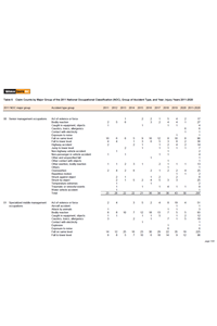 This table provides the claim count for occupational injuries by major group of the 2011 National Occupational Classification (NOC), and group of accident types, for each year between 2011 and 2020. The total claim count is also included for the same period.