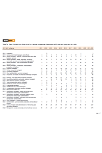 This table provides the claim count for occupational injuries by unit group of the 2011 National Occupational Classification (NOC), for each year between 2011 and 2020. The total claim count is also included for the same period.