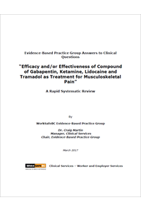 To determine whether there is any evidence to support the efficacy and/or effectiveness of a compound comprising of 5% gabapentin, 5% ketamine, 2.5 g lidocaine and 2.5 g tramadol in treating musculoskeletal pain, especially for muscle sprain/strain and contusion.