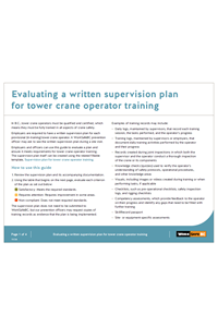 Employers are required to have a written supervision plan for any provisional (in-training) tower crane operator. This guide can be used to help ensure the supervision plan meets the requirements for tower crane operator training.