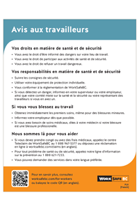This poster provides general information about workers’ health and safety rights and responsibilities. It also outlines what workers should do if they are injured at work, how to start a claim, and how to contact WorkSafeBC for help. Employers should post this notice where all workers will be able to see it.