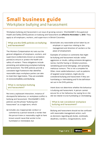 This guide is designed to help small businesses meet their occupational health and safety duties related to bullying and harassment.