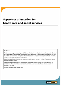 This resource is designed for employers, to help you plan and implement your supervisor orientation. It outlines the key health and safety topics for supervisors in health care and social services, and is formatted as a Microsoft Word document that you can customize to fit the needs of your workplace.