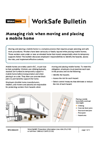 Moving and placing a mobile home is a complex process that can result in serious injuries if workers are under or near an elevated home that moves unexpectedly. This bulletin discusses employers’ responsibilities for proper planning and safe work procedures to keep workers safe.