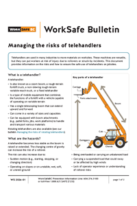 Telehandlers are used in many industries to move materials on worksites. They can put workers at risk of injury due to rollovers, load failure, or struck-by incidents. This bulletin provides information on the risks and how to ensure the safe use of telehandlers on jobsites.