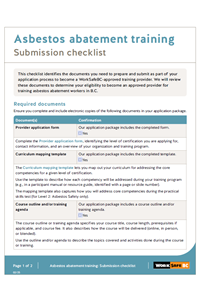To become a training provider to offer asbestos abatement training in B.C., you must be approved by WorkSafeBC. This checklist identifies the documents you need to submit as part of the application process to become an approved trainer.