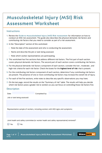 This worksheet is intended to help employers assess the risk of MSIs and should be used alongside our Guide to Musculoskeletal Injury (MSI) Risk Assessment. The worksheet helps you assess risk according to various physical risk factors. This is just one tool you can use to assess the risk of MSIs. You may use other acceptable assessment tools if you wish.