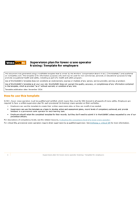 Employers are required to have a written supervision plan for provisional (in-training) tower crane operators. This fillable template is provided to help employers create their supervision plan. Refer to Evaluating the competency level of a tower crane operator for descriptions of each competency level.