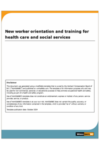 This resource is designed for employers, to help you plan your orientation and training for new workers. It outlines the key health and safety topics for workers in health care and social services, and is formatted as a Microsoft Word document that you can customize to fit the needs of your workplace.