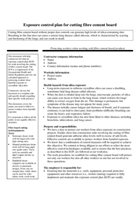 This document will help contractors develop an exposure control plan (ECP) for work involving the cutting of fibre cement board. The ECP is a requirement of the Occupational Health and Safety Regulation and sets out a detailed approach to protecting workers from harmful exposure to crystalline silica dust.