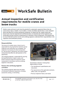 Mobile cranes and boom trucks have the potential to fail and cause serious injury or death. This equipment must be inspected and certified annually to reduce the risk. This bulletin discusses the responsibilities of machine owners and certifying engineers in the inspection and certification process.