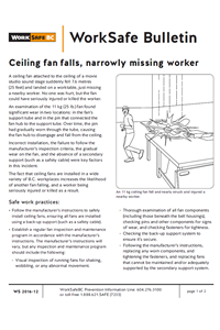 A ceiling fan in a movie sound studio fell suddenly and landed on a worktable — nearly striking a nearby worker. This bulletin focuses on safe work practices for installing, inspecting, and maintaining ceiling fans in all workplaces that use ceiling fans.
