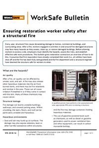 After a structural fire, restoration workers engaged in activities in and around fire-damaged structures may face many hazards as they assess, clean up, or restore damaged buildings. This bulletin provides an overview of the hazards and risks, and outlines safe work practices.