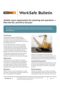 Every mobile crane lift is potentially hazardous and must be planned and carried out safely, according to the requirements of the Workers Compensation Act and Occupational Health and Safety Regulation.