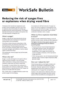 Workplaces that manufacture engineered wood products and wood pellets may be at risk of fires or explosions due to the buildup of synthesis gas (syngas) in the wood drying process. This bulletin describes the hazard and discusses some options that can help employers manage the risk.