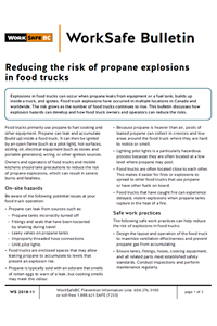 Explosions in food trucks can occur when propane leaks from equipment or a fuel tank, builds up inside a truck, and ignites. Food truck explosions have occurred in multiple locations in Canada and worldwide. The risk grows as the number of food trucks continues to rise, although the risk is preventable. This bulletin discusses how explosion hazards can develop and how food truck owners and operators can reduce the risks.