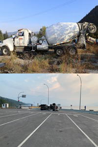 A worker was operating a fully loaded concrete mixer truck to deliver concrete mix to a workplace. The mixer truck was driving down a winding, downhill road that led to a plateau and then a final descent just above the staging area for a vehicle ferry. After completing the final descent, the mixer truck entered the oncoming lanes of traffic in which vehicles were driving off a ferry. The mixer truck turned to the right at the front of two rows of parked vehicles waiting to board the ferry and then tipped over onto its left side, resulting in serious injuries to the operator.
