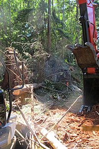 Several trees were being felled on a residential building site. The hemlock being felled at the time of the incident was growing out of an old tree stump 4 to 5 feet (about 1.4 metres) above the ground. An arborist cut a step in the side of the old stump to reach the hemlock he was falling. Another worker used an excavator bucket to touch the hemlock to provide directional control as the arborist cut the undercut and backcut. The hemlock began to fall. As it fell, it brushed a nearby tree. The butt of the falling tree came off the stump and kicked backward, striking the arborist. The arborist succumbed to his injuries in hospital.