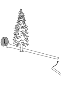 - Improper bucking on steep terrain: The steep slope on which this blown-down tree was located meant that its heavy rootwad could easily slide downhill. As well, the open area where the faller made his bucking cut permitted the blown-down tree to pivot freely. A safe bucking solution would have been for the faller to buck this tree as close to the pivot point as possible.