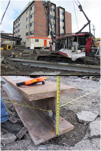 - Reduced contact between clamp and H-beam web. The fixed jaw side of the caisson clamp was broken, which reduced the contact area by 77%. On the hydraulic cylinder side of the caisson clamp, the contact area with the H-beam web was reduced by the hole in the web. When the clamping cylinder was over the hole, the contact area was reduced by 33%. The force with which the clamp held onto the H-beam was affected by this reduction in contact, but was likely not overly compromised. However, the clamp attachment was not designed for extracting H-beams, so the H-beam had to be positioned off the centreline of the vibratory hammer, which increased the risk of the H-beam being inadvertently released.