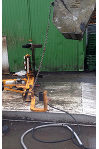 At a recycling plant, organic waste containers were being moved using a portable hydraulic tote tipper (referred to as a tipper — a device for emptying waste containers into a large bin). The tipper fell off the loading dock where it was stationed. Three workers attempted to lift the tipper back up onto the loading dock using a telehandler and a chain. One of the workers was beside the tipper, guiding it as it was being lifted. The tipper’s base struck the top edge of the loading dock. The chain came loose from the tipper, and the tipper fell onto the worker. The worker sustained serious injuries.