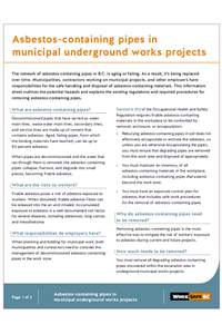 The network of asbestos-containing pipes in B.C. is aging or failing. As a result, it’s being replaced over time. Municipalities, contractors working on municipal projects, and other employers have responsibilities for the safe handling and disposal of asbestos-containing materials. This information sheet outlines the potential hazards and explains the existing regulations and required procedures for removing asbestos-containing pipes.