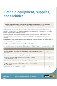 Employers are responsible for ensuring their workplace has the required first aid equipment, supplies, and facilities to treat injured workers. This resource identifies the recommended minimum contents for personal, basic, intermediate, and advanced first aid kits, as well as for first aid rooms and dressing stations.