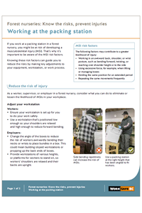 Workers in forest nurseries repeatedly perform movements every day that can put them at risk of developing musculoskeletal injuries (MSIs). This information sheet outlines how to reduce the risk when working at a packing station.