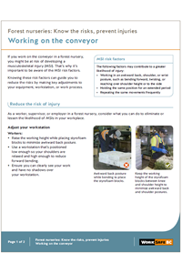 Workers in forest nurseries repeatedly perform movements every day that can put them at risk of developing musculoskeletal injuries (MSIs). This information sheet outlines how to reduce the risk when working on the conveyor.