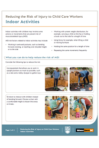 As a child care worker, you may engage in activities that present a risk of musculoskeletal injury (MSI). Learn about ways to reduce risks related to indoor activities.