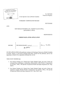 Injunctions are court orders from the Supreme Court of B.C. that require a person or business to comply with the Workers Compensation Act, occupational health and safety requirements, or a WorkSafeBC order.