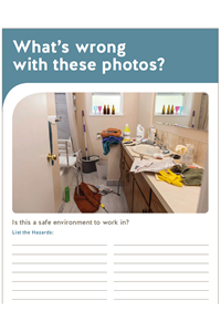 This series of photos illustrates a care worker bathing a client. They show many hazards that may be encountered by a care worker while providing care in a client's bathroom. You can use these photos during safety meetings, or post them on the wall to encourage staff to spot the hazards.